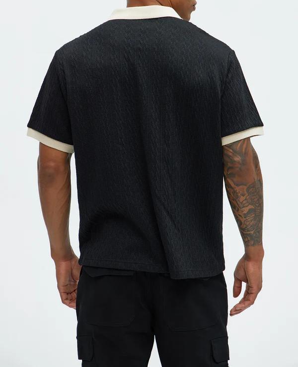 Home / All / Custom T-Shirts / Polo Shirts / Men's Black Textured Polo Shirt with Beige Contrast Collar Short Sleeve Casual Knit Top